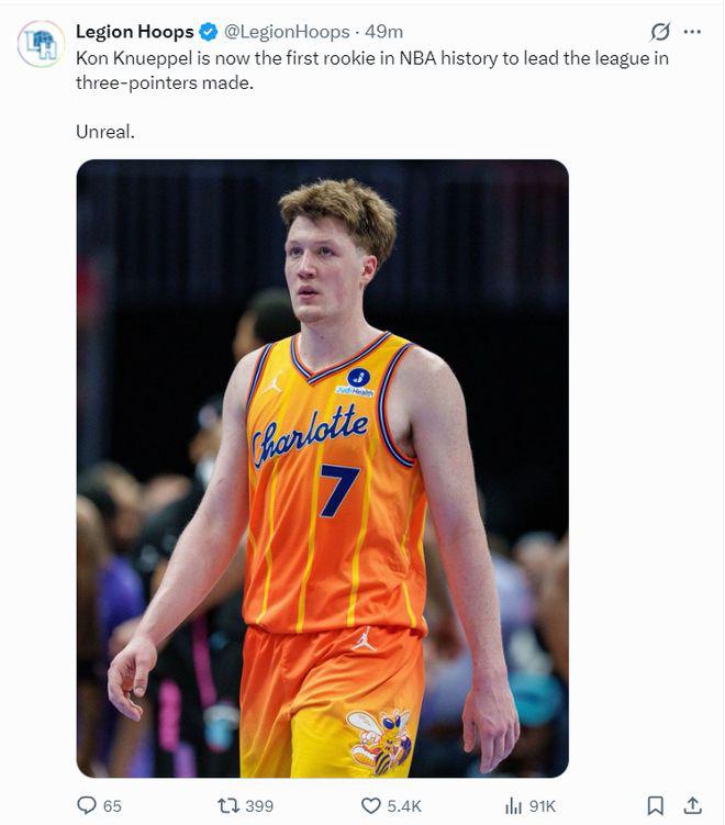 最终克努佩尔以单赛季 273 个三分球成为本赛季的三分王,他也成为 NBA 历史首位新秀赛季就拿到三分王的球员,本赛季他场均 18.5 分 5.3 篮板 3.4 助攻,三分命中率高达 42.5%,他是最佳新秀的大热门。