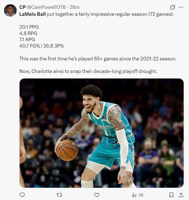 这场比赛拉梅洛 - 鲍尔 29 分钟,19 中 7,三分 16 中 5,拿到 19 分 7 篮板 6 助攻 2 抢断 5 失误,命中率 36.8%,三分命中率 31.2%,说实话表现很一般。