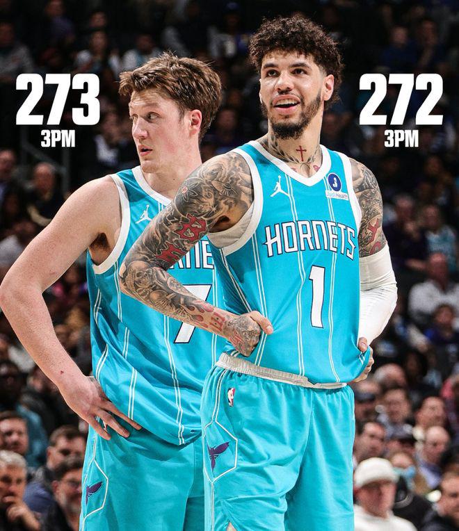本赛季三球 272 个三分 + 克努佩尔 273 个三分,他们成为历史第二对单赛季都命中 270+ 三分的队友比肩库里 / 克莱,本赛季黄蜂有三位球员至少命中 200+ 三分(鲍尔、克努佩尔、米勒)历史第四队。